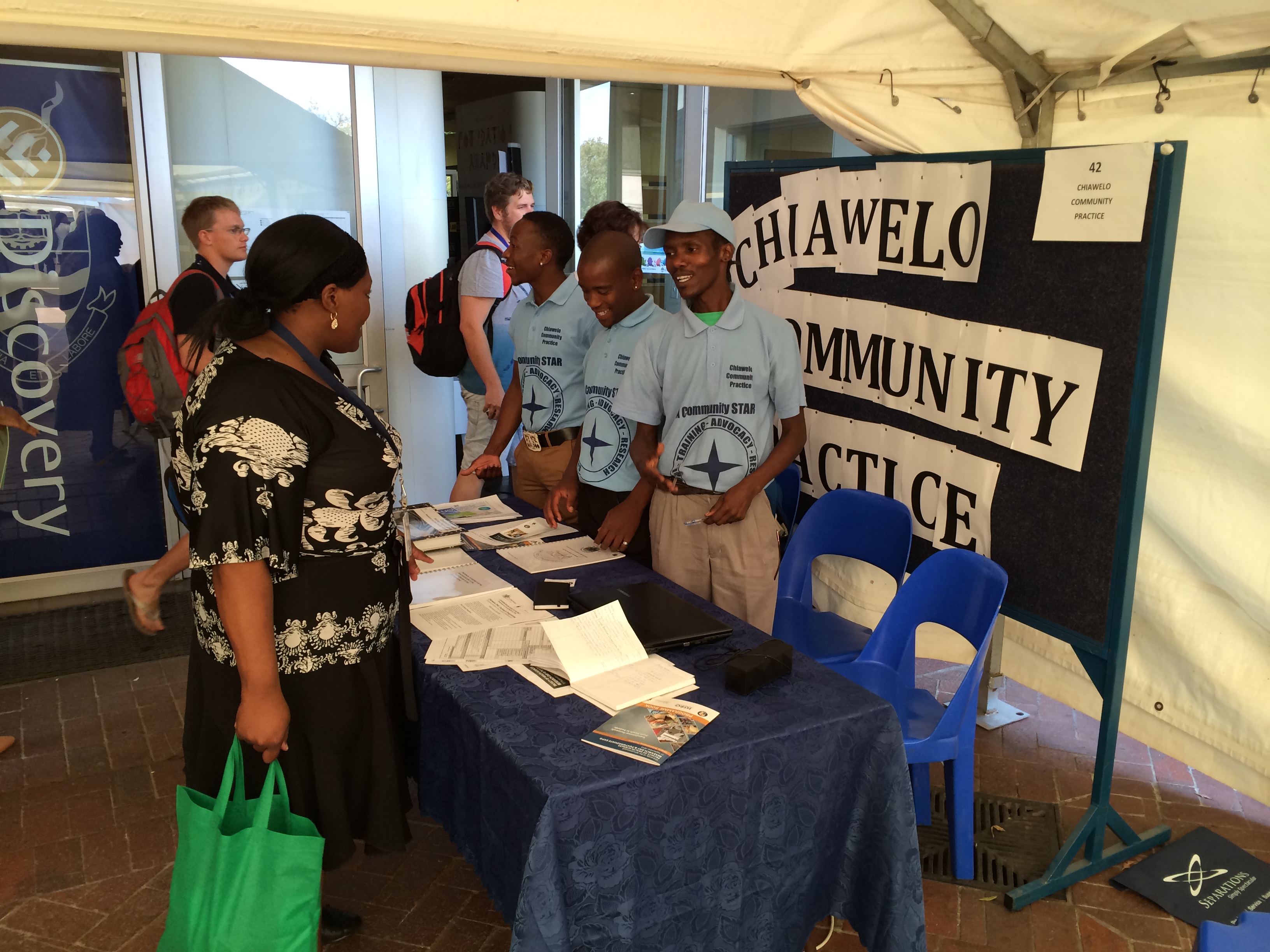 CHWs from Chiawelo Community Practice (CCP) were represented well with three very enthusiastic CHWs – David, Nkosinathi and Gundo – manning a stand in the Wits Research Day at Medical School. There were actively ‘selling’ CCP to students and professors whilst the video on CCP ran. Many academics noticed them and have shown indicated interest in visiting CCP. They collected names and contact details and went away satisfied with their experience.