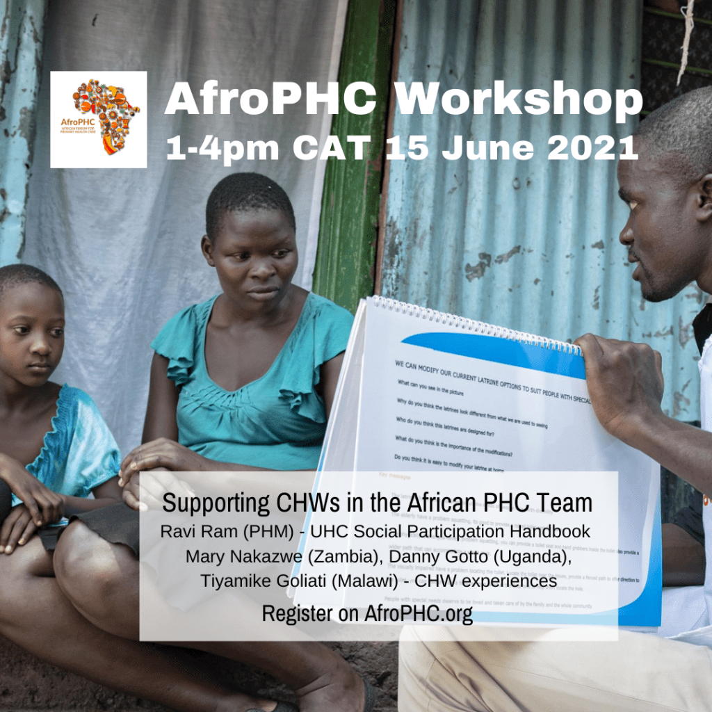 Join the AfroPHC Policy Workshop 1-4pm CAT on Tuesday 15th June 2021 on “Supporting Community Health Workers in the African PHC Team”. This will be in the format of a moderated discussion with panellists for 90min and then group discussion (60min) and feedback (30min). See details and register here.