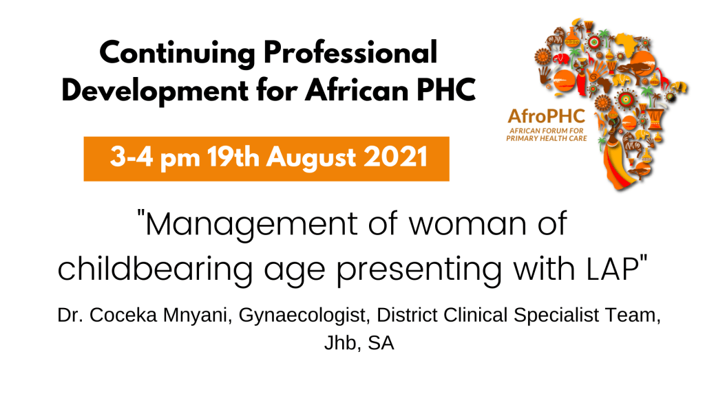 See Dr. Coceka Mnyani, Gynaecologist in the District Clinical Specialist Team, Jhb, SA, talk about the “Management of the woman of childbearing age presenting with LAP” at 3 pm on Thursday 19th August 2021 in the CPD webinar of the African Forum for Primary Health Care (AfroPHC). This will be accredited for CPD for South Africa for now but we are busy arranging it via World Continuing Education Alliance for these meetings to be accredited for CPD in many African countries.