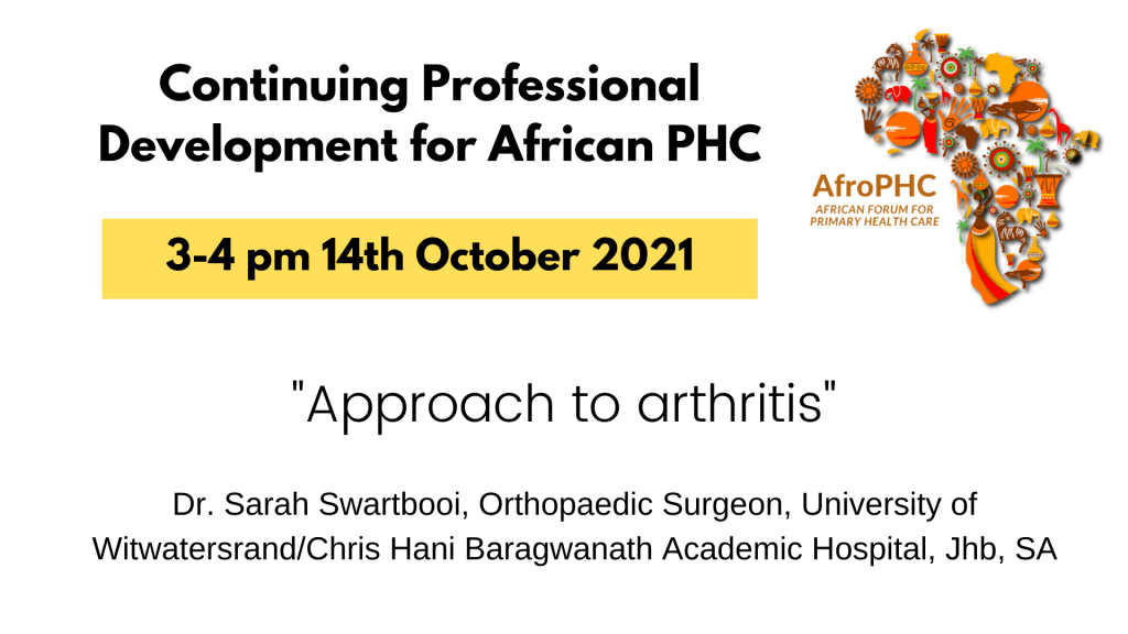 See Dr. Sarah Swartbooi, Orthopaedic Surgeon, University of Witwatersrand/Chris Hani Baragwanath Academic Hospital, Jhb, SA, talk about the “Approach to arthritis” at 3 pm on Thursday 14th October 2021 in the CPD webinar of the African Forum for Primary Health Care (AfroPHC). This will be accredited for CPD for South Africa for now but we are busy arranging it via World Continuing Education Alliance for these meetings to be accredited for CPD in many African countries.