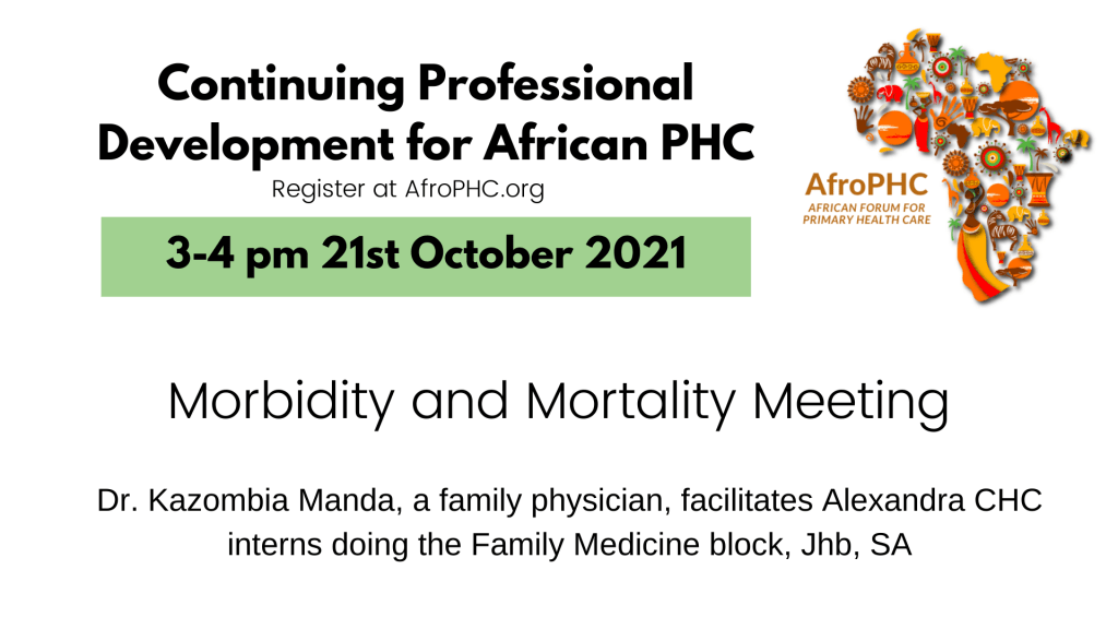 See Dr. Kazombia Manda, family physician from Johannesburg Health District and University of Witwatersrand, Jhb, SA, facilitate interns from Alexandra CHC in a “Morbidity and Mortality Meeting” at 3 pm on Thursday 21st October 2021 in the CPD webinar of the African Forum for Primary Health Care (AfroPHC). This will be accredited for CPD for South Africa for now but we are busy arranging it via World Continuing Education Alliance for these meetings to be accredited for CPD in many African countries.