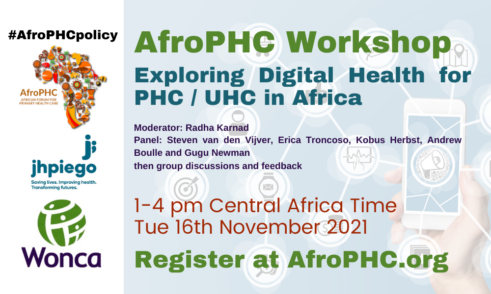 AfroPHC is partnering this month with WONCA eHealth – the Working Party on Digital Health “Rural WONCA” and Jhpiego. We invite you to a joint eWorkshop 1-4 pm Central Africa Time on Tuesday 16th November on “Exploring Digital Health for PHC / UHC in Africa”. Check for your local time here.