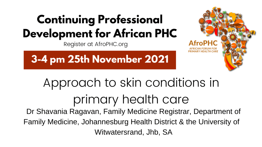 See Dr Shavania Ragavan, Family Medicine Registrar, Department of Family Medicine, Johannesburg Health District & the University of Witwatersrand, Jhb, SA, talk about the “Approach to Skin Conditions in African Primary Health Care” at 3 pm on Thursday 25th November 2021 in the CPD webinar of the African Forum for Primary Health Care (AfroPHC). This will be accredited for CPD for South Africa for now but we are busy arranging it via World Continuing Education Alliance for these meetings to be accredited for CPD in many African countries.