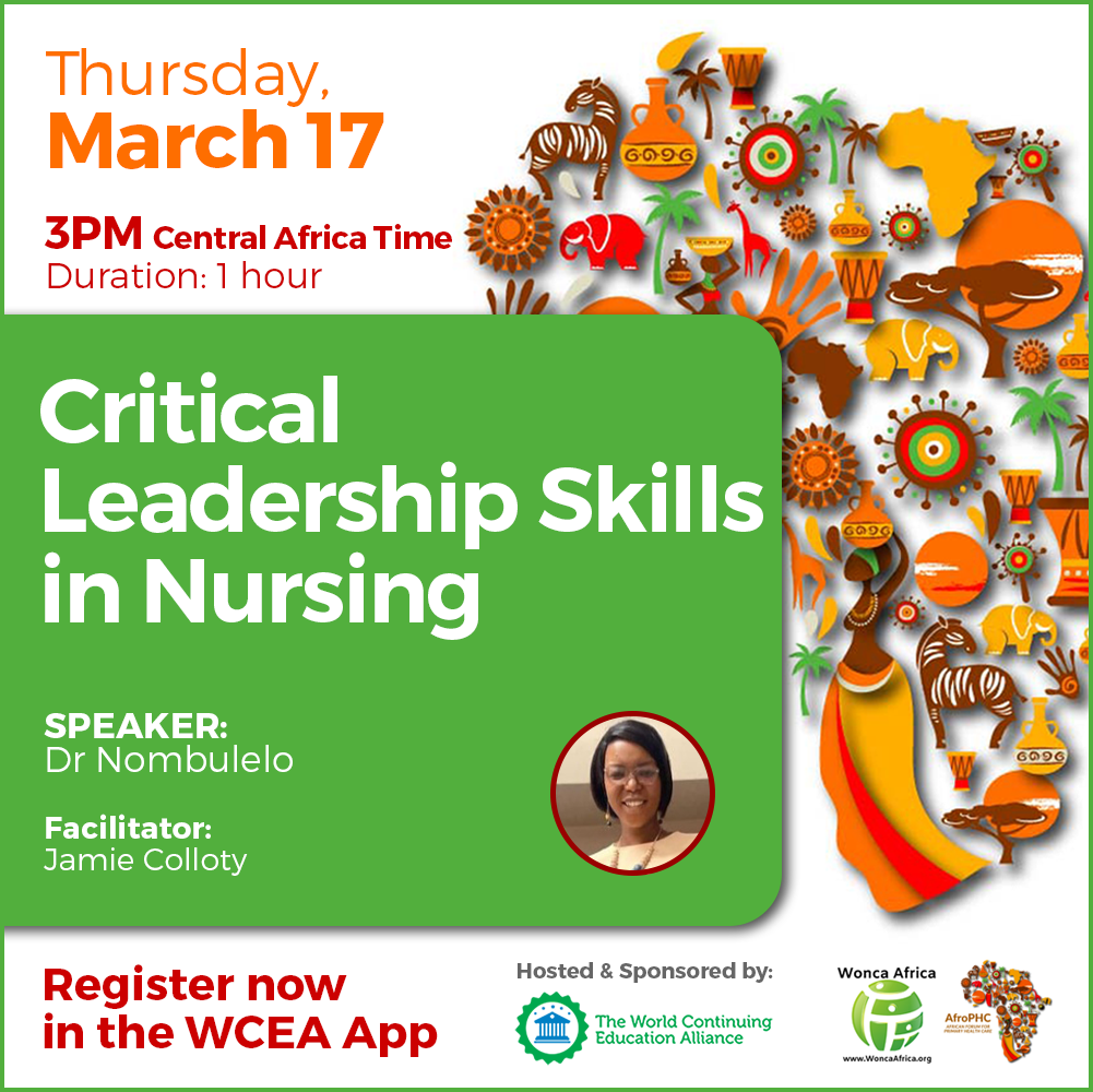 See Ms Numbulelo Zenani, Nombulelo Zenani Nurse and Senior Lecturer from the North-West University’s (NWU’s) School of Nursing , talk about “Critical Leadership Skills in PHC” at 3 pm on Thursday 17th March 2022 in the CPD webinar of the African Forum for Primary Health Care (AfroPHC). This is accredited for CPD across Africa and accessible via World Continuing Education Alliance. See post here
