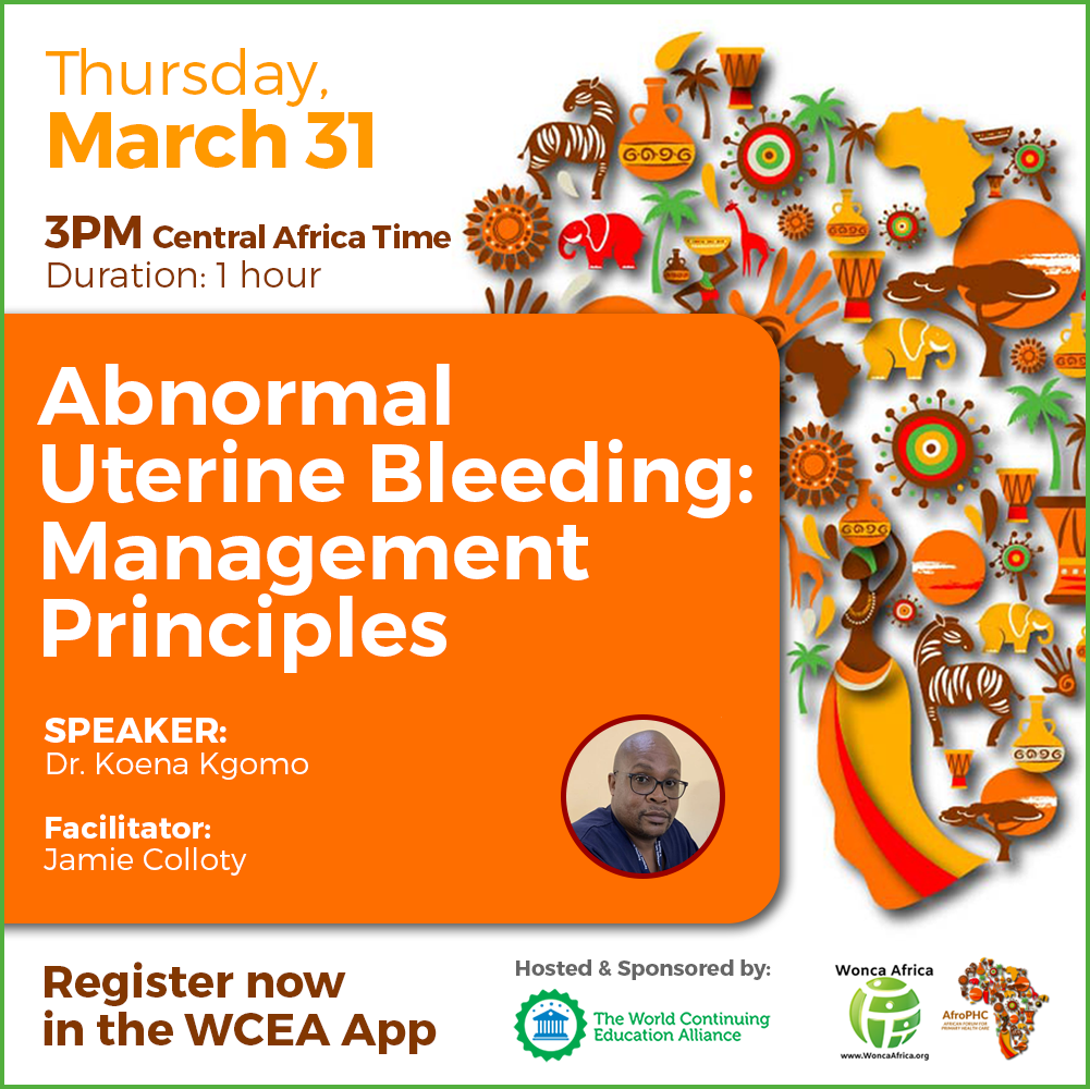 See Dr Koena Kgomo, Obstetrician from Chris Hani Baragwanath Academic Hospital, Johannesburg, South Africa talk about “Abnormal Uterine Bleeding” at 3 pm on Thursday 31st March 2022 in the CPD webinar of the African Forum for Primary Health Care (AfroPHC). This is accredited for CPD across Africa and accessible via World Continuing Education Alliance. See post here. There will be French translation.