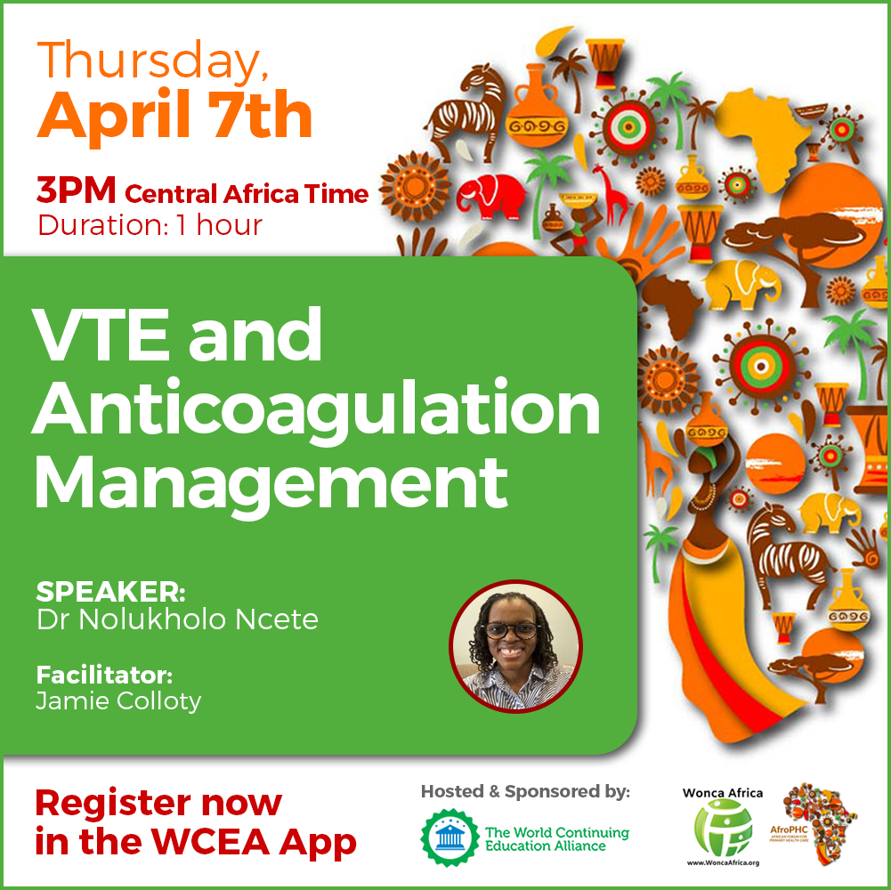 See Dr Nolukholo Ncete, Internal Physician from Chris Hani Baragwanath Academic Hospital, Johannesburg, South Africa talk about “Venous Thrombo-embolism” at 3 pm on Thursday 7th April 2022 in the CPD webinar of the African Forum for Primary Health Care (AfroPHC). This is accredited for CPD across Africa and accessible via World Continuing Education Alliance. See post here. There will be French translation.