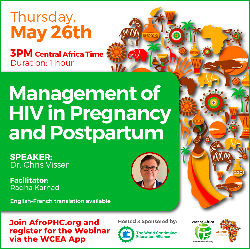See Dr Chris Visser, Family Physician from the District Clinical Specialist Team, Johannesburg, South Africa talk about “Management of HIV in Pregnancy and Postpartum” at 3 pm on Thursday 26th April 2022 in the CPD webinar of the African Forum for Primary Health Care (AfroPHC). This is accredited for CPD across Africa and accessible via World Continuing Education Alliance. There will be French translation. Details below