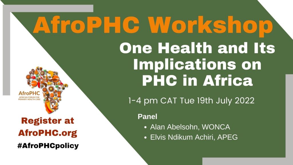 Join AfroPHC is its next interactive AfroPHC Policy Workshop on “One Health and Its Implications on Primary Health Care in Africa” 11am-2 pm GMT on Tuesday 19th July. Check your local time here.