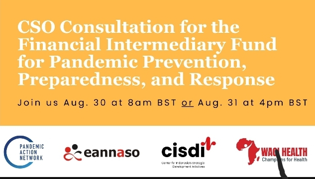 Join Pandemic Action Network, the Center for Indonesia’s Strategic Development Initiatives (CISDI), the Eastern Africa National Networks of AIDS Service Organisations (EANNASO), and WACI Health for the next official Civil Society Organization (CSO) consultation for the design phase of the new Financial Intermediary Fund (FIF) for Pandemic Prevention, Preparedness, and Response (PPR). This is the next consultation in an ongoing process.