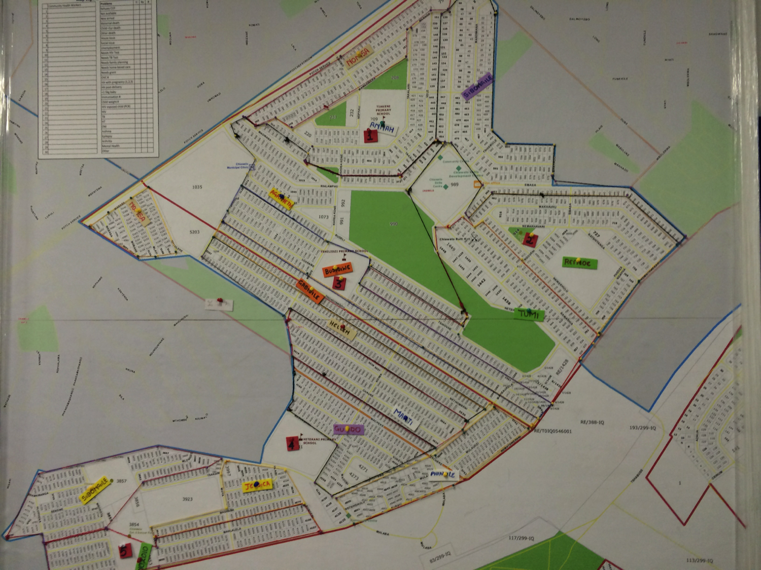 This is a map on the wall in the Chiawelo Community Practice’s Seminar Room. We have been able to demarcate each CHWs streets. We have grouped three CHWs in an area – this will be the focus of much of the activity in the community e.g. daily walking club and weekly health meeting. The workload does add up to quite a bit. There are 2703 Lots in this area with 6457 families identified. This means 2.4 families per lot. CHWs have registered only 2340 families and identified 10046 people. This means 4.5 persons per family. At this rate we may have well over 20 000 people in half the ward. The board is a large 1.6m x 1.6m but the lots are about 1cm on it – impossible to pin up all the problems in such small space for 2-3 families. We will have to prioritise problems and use it to visualise temporarily….
