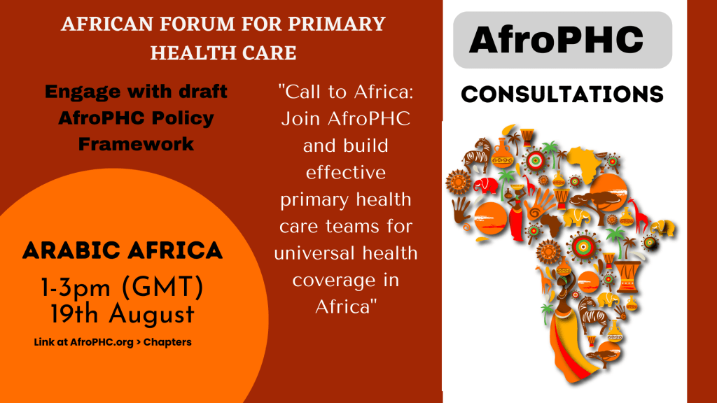 We had a consultation 1-3pm GMT Friday 19th August to meet with as many colleagues from Egypt, Algeria, Sudan, Morocco, Tunisia, Libya [with English-French-Arabic translators]. The consultation was facilitated by Almoghira Abdella / Ahmed Sallam and discussed AfroPHC as well as the AfroPHC draft policy framework.