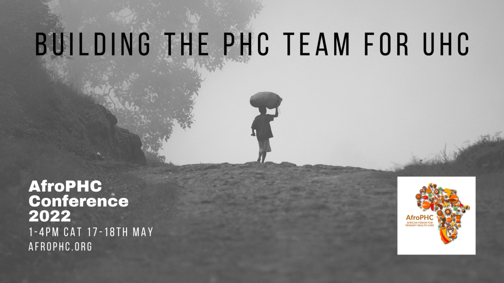 The AfroPHC Conference was online 1-4pm CAT on 17 and 18 May 2022. The theme was “Building the PHC team for UHC in Africa”. We focused on the draft policy framework. See latest below. (This draft still has some comments that have not been acted on yet. A task team will take these and the conference comments and finalise the document for the next phase: wider consultations with stakeholders, including AfroPHC chapters, across Africa [May-August 2022]; Executive/Advisory Board Workshop [Sep 2022] and Document Launch [Nov-Dec 2022].)