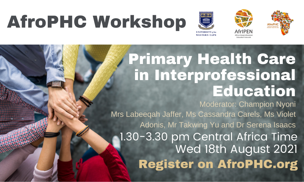 AfroPHC, AfrIPEN and the University of Western Cape invite you to a joint blended eWorkshop 1.30-3.30 pm Central Africa Time on Wednesday 18th August. At the start of the academic year, the IPEU of UWC disseminates IPE learning and teaching activity dates to the faculty. UWC has an IPE Faculty Development Workshop on 18th Aug and has offered to do this jointly with AfroPHC and AfrIPEN. In this way, we are hoping to attract a larger audience and greater participation from our respective communities. The idea is to use the five principles of PHC as the session themes where each theme will commence with a 10-15 min presentation on how the principle has been incorporated into the curricula of the speaker’s department. Dr. Champion Nyoni, President of AfrIPEN and Executive Board member of AfroPHC, will introduce each session and the speaker(s). It will be very interactive by following each theme with a practical activity in a breakout session to ensure optimal engagement and benefit for each attendee.