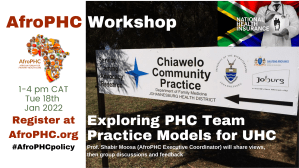 AfroPHC is kicking off 2022 with the first interactive AfroPHC Policy Workshop on “Exploring PHC Team Practice Models for UHC” 1-4 pm Central Africa Time on Tuesday 18th January. Check your local time here.