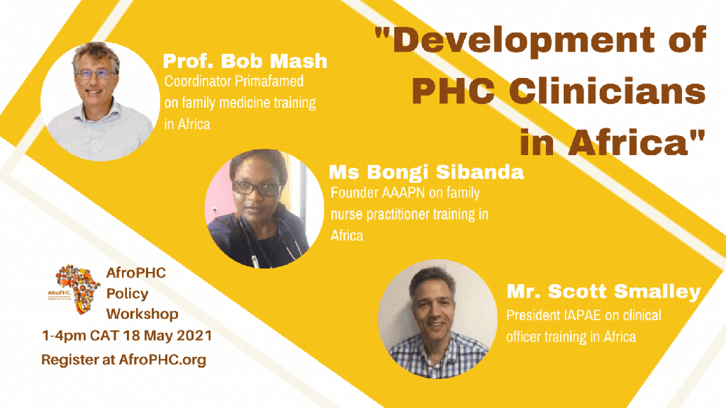 Join the AfroPHC Policy Workshop on 18th May 2021 on “Development of PHC clinicians in Africa”. This will be in the format of a moderated discussion with panellists and then group discussion and feedback.