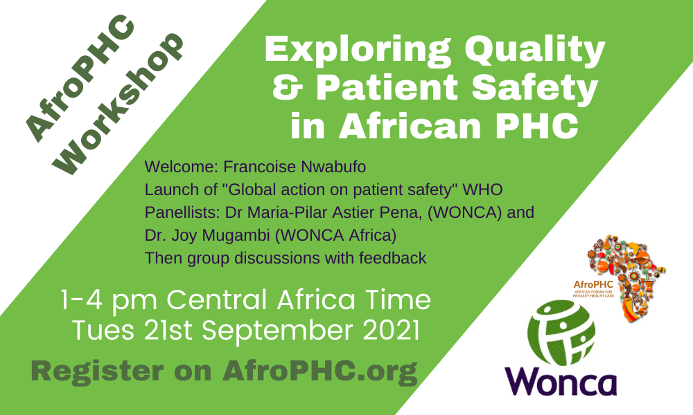 AfroPHC and WONCA Working Party on Quality and Patient Safety invite you to a joint eWorkshop 1-4 pm Central Africa Time on Tuesday 21st September on “Exploring Quality and Patient Safety in African PHC”. Check for your local time here.