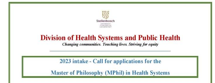 The Division of Health Systems and Public Health in the Department of Global Health, Faculty of Medicine and Health Sciences, Stellenbosch University, invites suitably qualified candidates to apply for a Master of Philosophy (MPhil) in Health Systems. This is a two-year part time programme, primarily offered online with some face-to-face engagements (depending on COVID-related restrictions, this training may be delivered via an online platform and students will not be expected to travel to Cape Town). The goal of the programme is to develop the participant’s knowledge, skills and practices in the field of health systems strengthening and research, and public health. The programme is designed to accommodate practitioners who work full-time, from a range of backgrounds including but not limited to social work, medicine, nursing, economics, health economics, public health, health service management, policy making and non-governmental organisations (NGOs). The training aims to build the research capacity and leadership of the participants in their work, while contributing to knowledge generation in Africa. The MPhil Health Systems programme is differentiated into two streams or tracks, allowing for a focused approach to Health Systems (HS) and Health Economic Evaluation (HEE). The purpose of the HEE track is to equip participants with skills to understand and evaluate the comparative costs and benefits of health system policies, strategies, and interventions to manage uncertainty and inform policy and decision-making using an evidence-based approach.